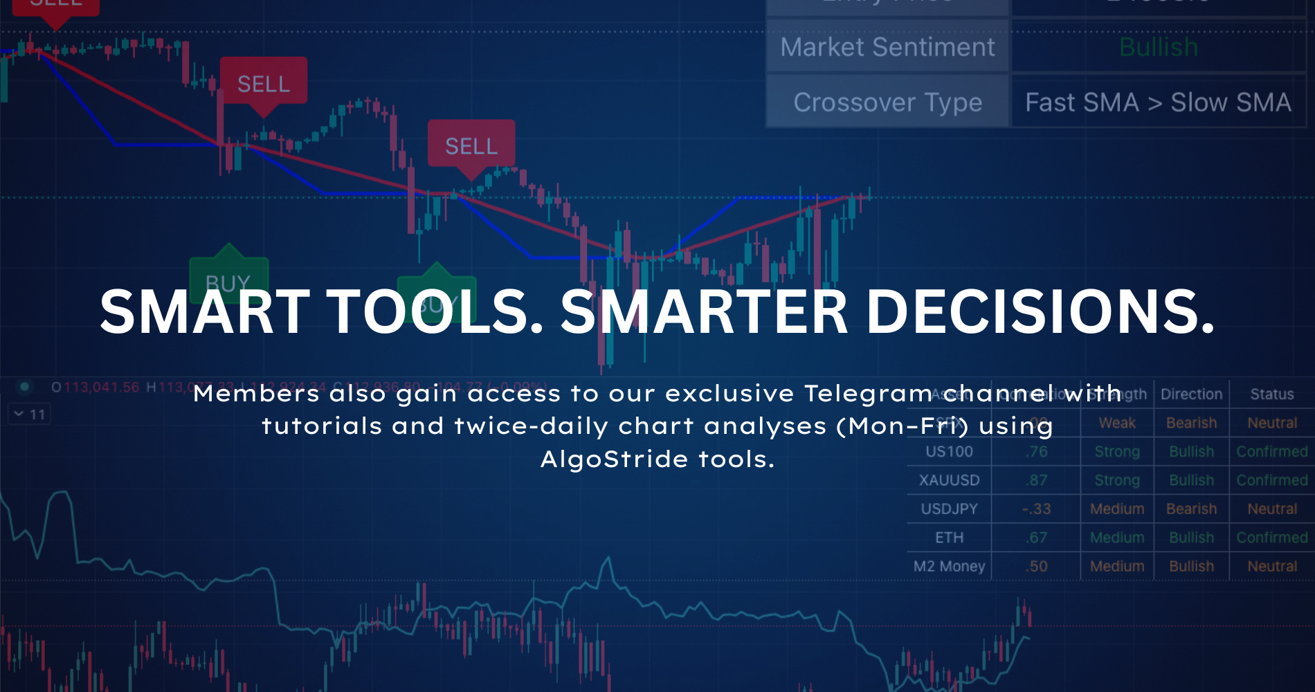 Full access to the whole AlgoStride Suite tools, twice-daily chart analysis (Mon-Fri), exclusive Telegram access